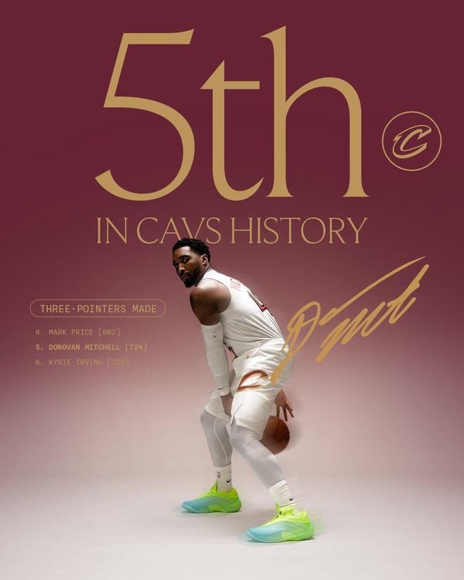 值得一提的是,米切尔在此役还创下了纪录。米切尔此战命中5记三分,他在骑士的三分球命中数来到724记,超越凯里·欧文,上升至骑士队史第五。